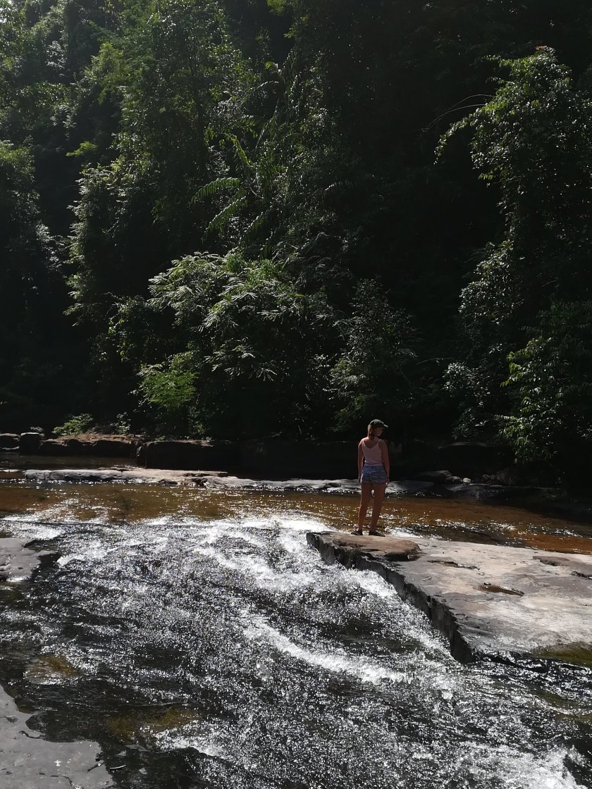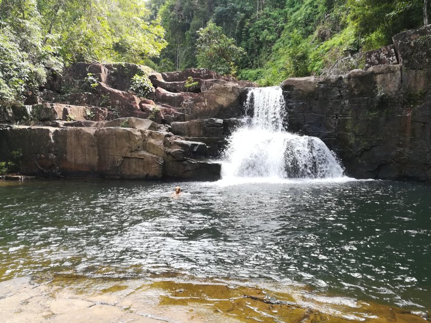 Wie zuvor auf Koh Chang und auf Koh Mak schauten wir uns die dritte Insel eine Woche lang an. Alle 3 Inseln sind komplett unterschiedlich. Koh Chang war von den Dreien die ‚touristische‘, Koh Mak die ‚ruhige‘ Insel und Koh Kood war eine Mischung aus beiden, weshalb sie uns am besten von den drei Inseln gefallen hat. Koh Kood hatte unserer Meinung nach die schönsten Strände. Ein weiterer Pluspunkt waren die Wasserfälle, die wir besucht haben. Einer war in unmittelbarer Nähe zu unserem Gasthaus, also nur 3 min mit dem Roller. Der Wasserfall war super schön, man konnte hier super schwimmen, Einheimische sind sogar von einem ca. 8 Meter hohen Baum gesprungen und das beste war die kühle Temperatur des Wassers. Von den Stränden sind wir recht warme Wassertemperaturen gewöhnt, umso erfrischender war die Abkühlung. An diesen Wasserfall sind wir deswegen auch 3 mal hingefahren.