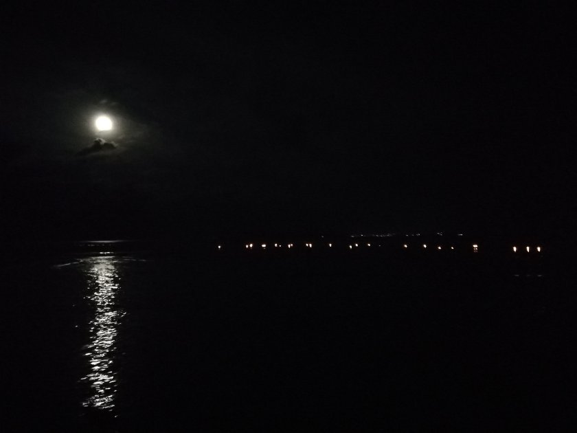 Wir hatten jetzt drei Abende Vollmond. Eine Bungalowanlage hat bisher jeden Abend entweder Lampions aufsteigen lassen oder Lichter ‚auf das Wasser gesetzt‘. Heute Abend gab es auch noch ein kleines Feuerwerk und ein Lagerfeuer.