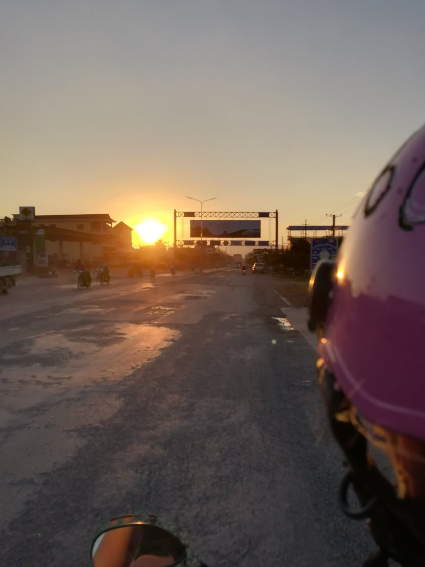 Einige Tage sind nun nach dem letzten Blog vergangen und in der Zwischenzeit haben wir auf Koh Rong die Seele baumeln lassen und sind nun an unserer letzten Station vor Vietnam angekommen: Kampot. Da uns Kambodscha so gut gefällt, haben wir uns entschieden noch ein bisschen länger zu bleiben. Nach kurzer Recherche haben wir uns für Kampot entschieden, da es direkt am Fluss und auf dem Weg nach Vietnam liegt. Nach einer action-reichen Speedboat Fahrt und 3 Stunden in einem Bus, der fast auseinander fiel, erreichten wir sehr erschöpft unser Gasthaus in Kampot. Wir waren gegen 17 Uhr angekommen und konnten noch den wunderschönen Sonnenuntergang genießen.